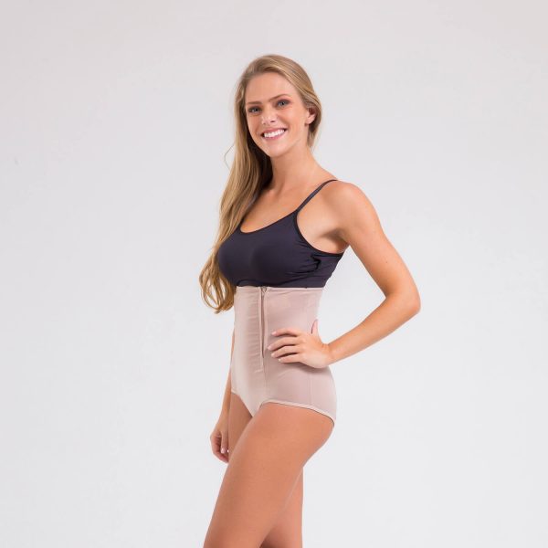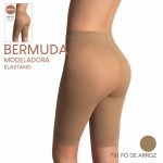 Bermuda modeladora Selene. Cintura com ajuste perfeito; Faixa de compressão média para afinar a cintura; Cinta para compressão da barriga; Fundelo de algodão; Cinta para levantar o bumbum; Faixa de compressão para eliminar os culotes e diminuir o quadril. Cor: pó de arroz; Tamanhos: P, M, G, EG; Composição: 83% poliamida e 17% elastano.