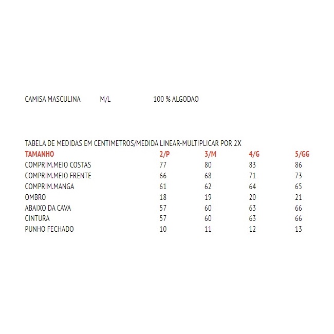 | Tamanho | G – GRANDE, GG – EG/GG/XG(G2), M – MÉDIO, P – PEQUENO |