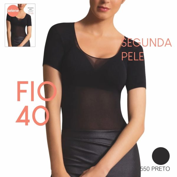 Segunda pele manga curta decotada fio 40 Selene. Cor: PRETO. Tamanho: ÚNICO – MANEQUIM 38 A 44. Composição: 98% POLIAMIDA, 2% ELASTANO.
