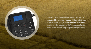 Se você procura por uma opção de telefone de mesa. mas com sinal de internet de um celular móvel. esta é a opção ideal! Com 10 vezes mais sensibilidade e 2 vezes mais potência de sinal que um celularcomum. o Telefone Rural 3G Multilaser oferece maior qualidade em suas ligações. Versátil. conta com 5 bandas. funciona como um modem 3G e acompanha cabo USB para distribuir internet. Além disso. o Telefone Rural Multilaser envia e recebe mensagens SMS. conta com função voz e dados e aceita chip de qualquer operadora!
