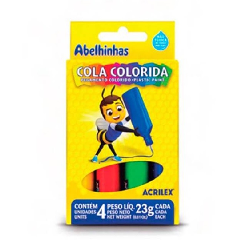 Foi desenvolvida para trabalhos escolares e artesanais. Ideal para atividades de desenvolvimento artístico, possui um exclusivo bico aplicador que facilita a pintura, podendo ser usada também com esponja ou pincel sobre papel, papel cartão e cartolina. Não é tóxica. Você pode misturar as cores obtendo novas tonalidades, dando mais vida ao colorido dos trabalhos. Depois de seca, a Cola Colorida Acrilex conserva a textura, o brilho, o relevo e as cores originais.