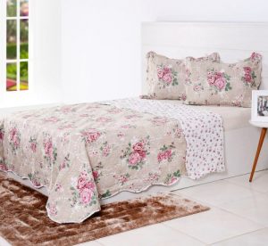 Queen: 2,30m x 2,50m + 2 Porta Travesseiros 50cm x 70cm + 3cm Abas. 100% Poliéster; Tecido: 65g/m² e Enchimento: 100g/m²; Dupla Face; Tecnologia Ultrassonic; Estampas sortidas.