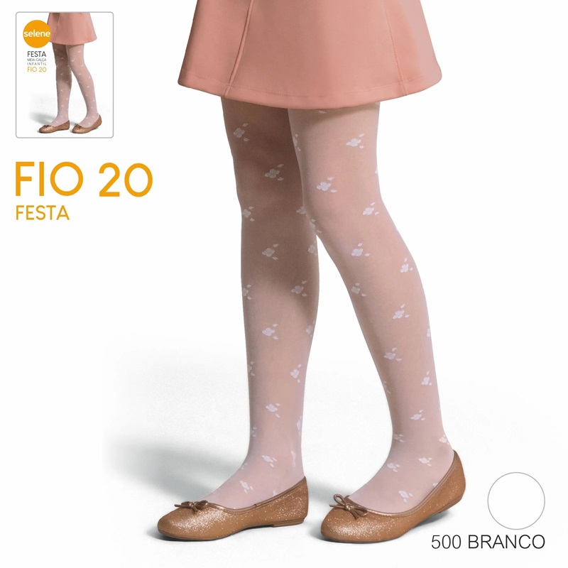 MEIA-CALÇA INFANTIL FIO 20 FESTA SELENE. COR: BRANCO. TAMANHO B: 1 A 2 ANOS; TAMANHO P: PESO(KG) 15 A 25 E ALTURA(M) 0,90 A 1,10; TAMANHO M: PESO(KG) 21 A 35 E ALTURA(M) 1,10 A 1,30. COMPOSIÇÃO: 98% POLIAMIDA, 2% ELASTANO.