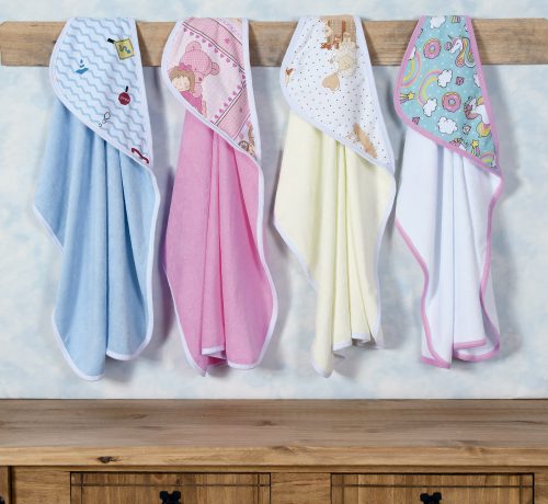 Composição: 85% Algodão 15% Poliéster; Gramatura: 230g/m²; Malha Atoalhada; Capuz Estampado; Tamanho: 70cm x 70cm; Cores/Modelos: Azul/Ursinho e Rosa/Elefantinho.