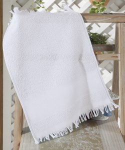 Toalha de mão ideal para bordar ponto cruz ou a máquina com 29 pontos na altura da barra, confeccionada em felpa 100% algodão, com 260 g/m². Possui acabamento em franjas. Tamanho: 25cm x 36cm.