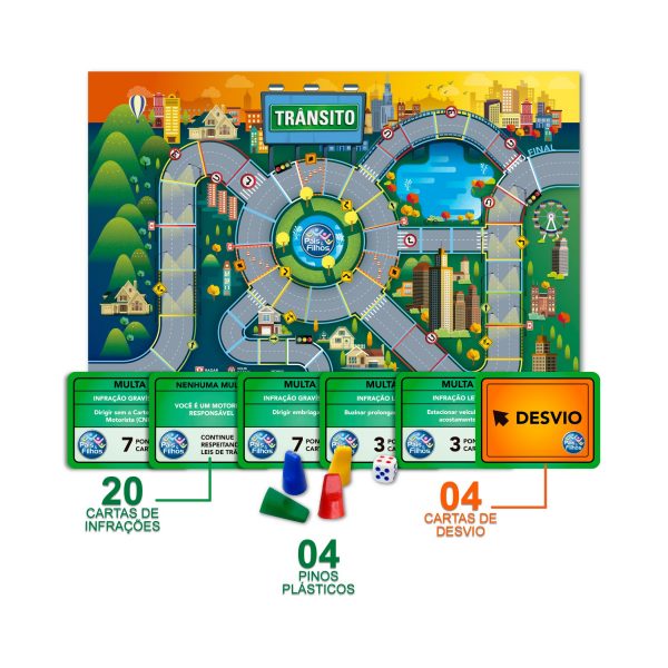 Idade: 6 anos. Medida Unit. Cx (cm): 36,6 x 23,3 x 4,5. Peso Unit.(Kg): 0,265. Contém na Embalagem: 1 Tabuleiro, 4 Pinos, 1 Dado, 20 Cartas de Infrações, 4 Cartas Desvio na Pista.